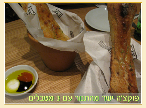 המלצרית הגיעה כמעט מיד, אדיבה ונחמדה, והציעה לנו את דיל 7 המנות: כל זוג בוחר ביחד 7 מנות: פוקצ'ה ומטבלים, 4 מנות ראשונות, מנה אחת עיקרית (משותפת) וקינוח אחד (משותף). והמחיר: 100 שקל לאדם (200 שקל לזוג). הצעה ממש מצויינת! ארבעתנו ביחד בחרנו ה-מון מנות..